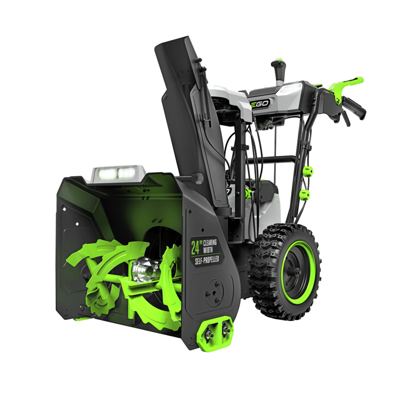 The EGO POWER+ 24 in. Self-Propelled 2-Stage XP Snow Blower with Peak Power™ exceeds the power and performance of gas without the noise, fuss, and fumes. This 24-inch two-stage snow blower features heated handle grips to help keep your hands warm in the coldest, snowiest conditions and trigger controlled steering assists with turning for more control. Its handle-mounted 2-in-1 chute adjustment lever directs and deflects snow where you need it with 200-degree directional control for efficient snow removal. With Peak Power+ technology, this cordless snow blower combines the power of any two EGO 56V ARC™ Lithium batteries to churn through the toughest snow conditions and what the snowplow leaves behind with ease—and throws it up to 50 feet. Clear a 24-car driveway with 8 inches of snow on a single charge when used with two recommended 10.0Ah ARC™ Lithium batteries (available separately). Get the job done easily with variable-speed self-propelled forward and reverse directions and four LED