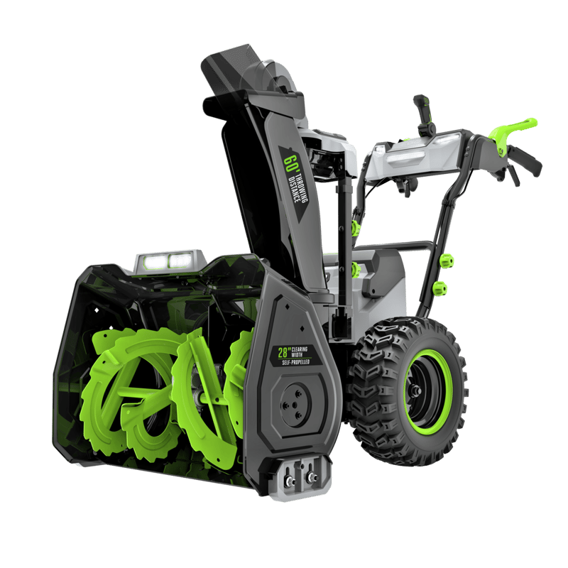 The EGO POWER+ 28 In. Self-Propelled 2-Stage Snow Blower with Peak Power™ exceeds the power and performance of gas without the noise, fuss, and fumes. Featuring Peak Power+ technology, EGO’s most powerful cordless snow blower combines the power of any two EGO 56V ARC™ Lithium batteries with a steel auger, a 28-inch clearing width, and 21-inch clearing height to churn through the absolute worst winter can unleash on you—and throws it up to 60 feet away. Its 2-in-1 electronic chute adjustment delivers effortless control of the 200-degree chute direction and deflection so you can throw snow where you need it for efficient snow removal. This 28-inch two-stage snow blower features heated handle grips to help keep your hands warm in the coldest, snowiest conditions while trigger-controlled steering assists with turning the machine for added control. Clear a 32-car driveway with 8 inches of snow on a single charge with two recommended 12.0Ah ARC™ Lithium batteries (available separately). Get